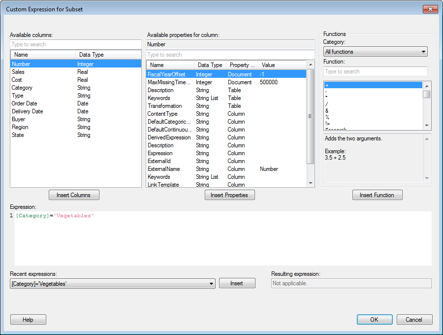 Select a function by clicking it in the list and then click the Insert Function button, or double-click the function to insert it in the Expression field. Type a search string in the text field to limit the number of items in the Functions list. You can also click any function and type the first letter of the desired function name to jump to a specific location in the list. |