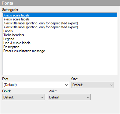 Lists all items for which you can change the font settings. Click to select an item in the list to change the settings for that text in the visualization. Press Ctrl and click more items to change the settings for multiple items simultaneously. |