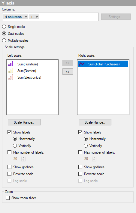 This option is suitable, if the magnitudes of your measures vary too much to be presented on the same scale, and two scales are enough to meet your needs. Still more than two measures can be shown as measures can share scale.