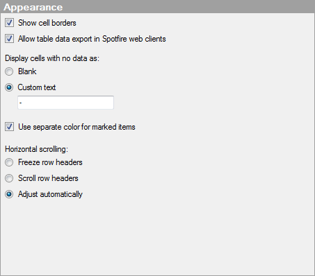 Select this option to automatically adjust the scrolling behavior to the available width. When the row headers take up most of the cross table width, then the row headers will also be scrolled horizontally. Otherwise, only the cross table columns will be scrolled, and the row headers frozen. If you select this option, the row headers are kept visible to the greatest extent possible, but the risk to hide all the cross table columns completely is eliminated. |