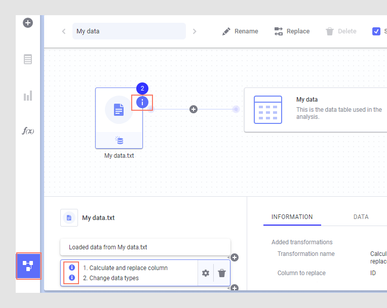 In this example, data has been loaded from a text file. Then, two transformations were inserted: first a "Calculate and replace column"-operation and then a "Change data types"-operation.