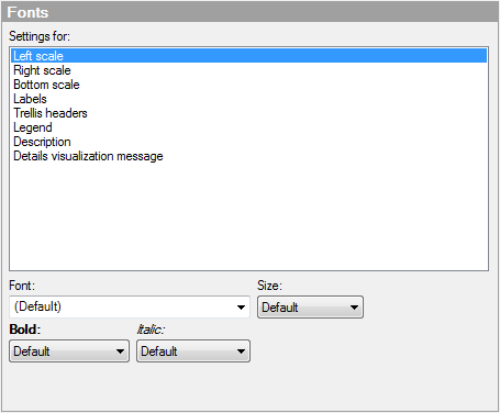 Lists all items for which you can change the font settings. Click to select an item in the list to change the settings for that text in the visualization. Press Ctrl and click more items to change the settings for multiple items simultaneously.