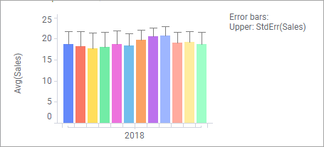 There are different ways to set up error bars in Spotfire. For aggregated values, you can use one of the existing measures, such as standard error or standard deviation. The length of the error bars will then be calculated. In the example below, a bar chart shows the average sales for each month during one year. The statistical measure standard error was used to calculate the length of the upper error bars. No lower error bars were defined in this graph.