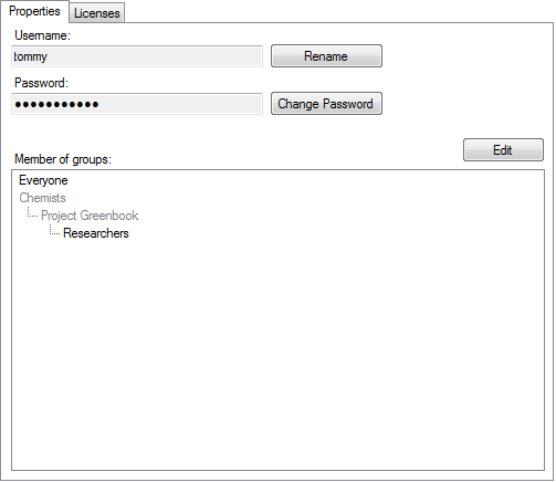 The user "tommy" is an explicit member of the Researchers group and the Everyone group. He is also by inheritance a member of the Project Greenbook group and the Chemists group.