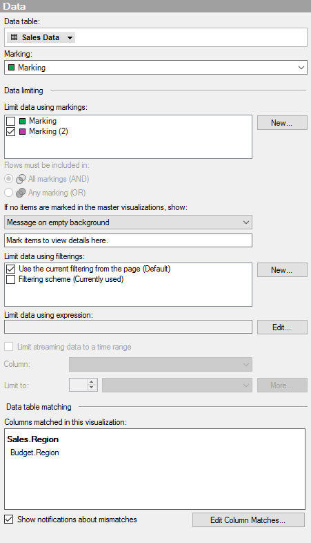 Lists the available markings that can be used to limit what is shown in the visualization. This means that the visualization only shows data that has been marked in other visualizations or has been marked within the visualization itself (master visualizations). If more than one marking is selected, you can choose how the data in the markings should be combined. Tip: You can specify what should be shown in the visualization if no items have been marked in the master visualizations. See the If no items are marked in the master visualizations, show drop-down list below. To be able to mark data, and show it within the visualization itself, the All data option should be selected in this list. See What is a Details Visualization? to learn more about how you can use master-details visualizations to drill down into your data. |