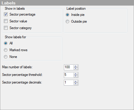 Determines whether to show labels for all pie sectors (All), pie sectors containing marked rows only (Marked rows), or not to show any labels at all (None). |