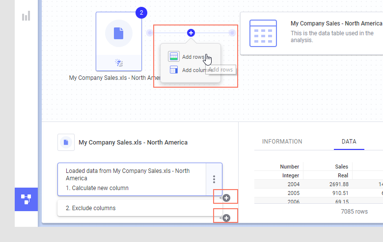В этом примере данные уже были получены из локального файла Excel. На холсте данных выберите необходимую таблицу данных, определите, где требуется добавить строки (между узлами в графической структуре или между группами преобразований) и нажмите кнопку Добавить строки: