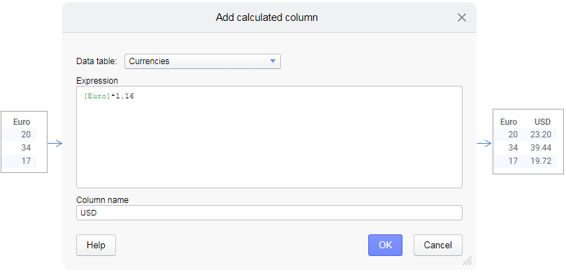在下图中,数据列中的欧元金额将以汇率 1.16 转换为美元。结果会添加到名为 USD 的新列中。