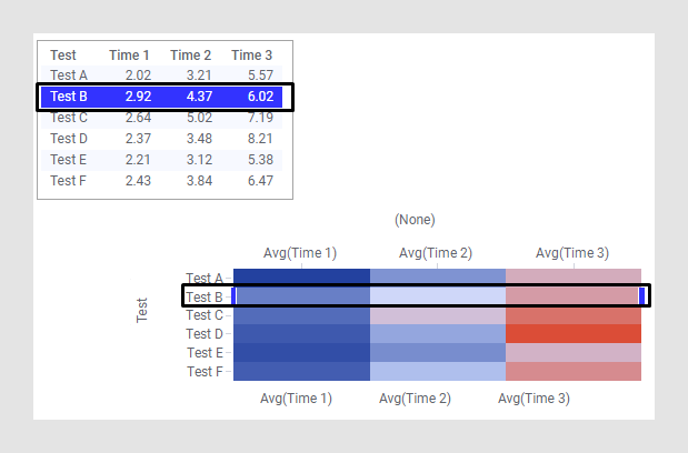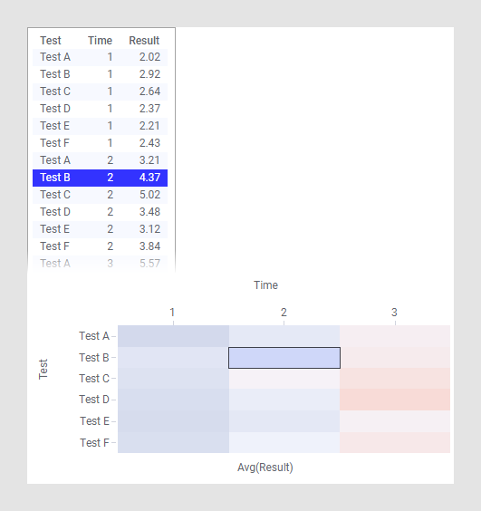 La columna Test está seleccionada en el eje Y, la columna Time en el eje X y los valores de celda están establecidos para la columna Result. Como en otras visualizaciones, el resaltado y las marcas del mapa de calor se aplican a una o más filas de la tabla de datos subyacente. Esto significa que con la configuración de este ejemplo, al marcar una fila en la tabla se marcará una celda en el mapa de calor.