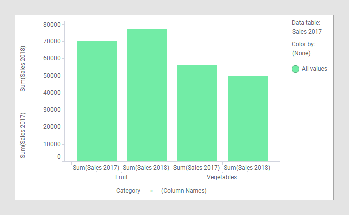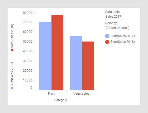 위의 두 데이터 테이블의 데이터를 막대 그래프에서 비교하려면 특별한 조정이 필요하지 않습니다. Spotfire로 두 데이터 테이블을 로드하고 막대 그래프를 만들고 범주 축에서 범주형 컬럼 중 하나를 선택한 다음 값 축에서 두 컬럼 'Sales 2017' 및 'Sales 2018'를 선택하면 됩니다.