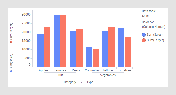 이러한 두 데이터 테이블의 데이터를 막대 그래프에서 결합하면 올해 어떤 과일과 야채가 목표에 도달했는지 알 수 있습니다.