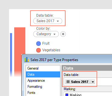 시각화 속성의 데이터 섹션이나 범례의 데이터 테이블 선택기에서 기본 데이터 테이블을 선택할 수 있습니다. 아래 이미지에서 기본 데이터 테이블의 이름은 'Sales 2017'입니다.