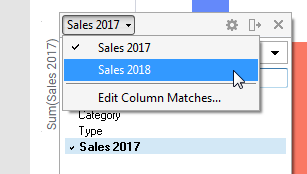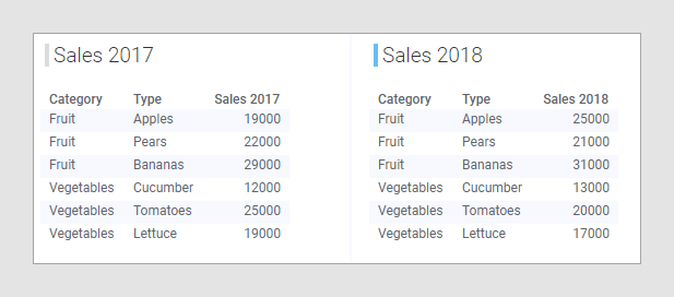알고 있어야 하는 또 하나의 중요한 개념은 컬럼 일치입니다. 시각화에서 여러 데이터 테이블의 데이터를 표시하려면 시각화를 일정 방식으로 그룹화하는 데 사용할 하나 이상의 컬럼이 시각화의 다른 데이터 테이블에 있는 해당하는 컬럼과 일치해야 합니다. 컬럼이 일치하려면 컬럼에 동일한 종류의 데이터가 포함되어 있어야 합니다. 컬럼이 동일한 데이터 형식의 값을 포함하고 이름이 같으면 자동으로 일치됩니다. 예를 들어 아래의 두 데이터 테이블 'Sales 2017' 및 'Sales 2018'에서 컬럼 'Category'와 'Type'은 두 데이터 테이블 간에 일치됩니다. 시각화를 구성할 때 기본 규칙은 시각화에서 사용할 모든 범주가 모든 데이터 테이블에 있어야 한다는 것입니다. 그러면 컬럼 일치가 쉬워집니다. 하지만 이 규칙에는 예외가 있습니다. 이에 대해 자세히 알아보려면 컬럼 일치 아래의 누락된 컬럼 일치에 대한 섹션을 참조하십시오.
