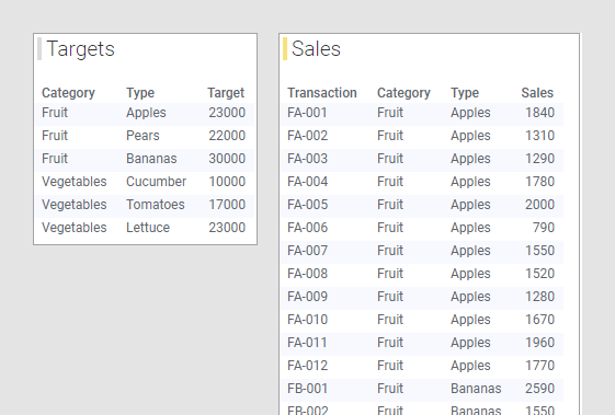 위 예에서는 데이터 테이블에 거의 동일한 컬럼('Category', 'Type' 및 판매 수치를 포함하는 컬럼)이 포함되어 있었습니다. 하지만 경우에 따라서는 다른 수준의 상세 정보에 대한 데이터를 포함하는 데이터 테이블의 데이터를 시각화에서 비교할 수도 있습니다. 예를 들어 특정 연도의 판매 목표와 지금까지의 실제 판매를 비교하고자 할 수 있습니다. 과일 및 야채에 대한 판매 목표가 포함된 데이터 테이블이 있을 것입니다. 아래 'Targets' 데이터 테이블에 나와 있듯이 각 과일 및 야채 종류에 대해 하나의 단일 행은 목표를 나타냅니다. 아래의 'Sales' 데이터 테이블에 나와 있듯이 다른 데이터 테이블에는 금년의 실제 판매 데이터가 있을 수 있습니다. 이 데이터 테이블에서 각 판매 트랜잭션이 하나의 행으로 표시되므로 각 종류의 과일 및 야채에 대해 여러 행의 판매 수치가 있습니다.