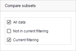 Cuando haya filtrado datos en su análisis, es posible visualizar las siguientes tres categorías; los datos filtrados, los datos que quedan fuera del filtro y la información completa. Estas categorías se pueden comparar en una única visualización seleccionando la opción (Subconjuntos) en un selector de columnas.
