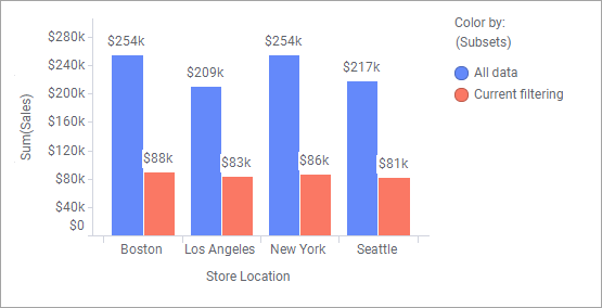 Usando subconjuntos, puede mostrar las ocho barras anteriores simultáneamente en el gráfico de barras seleccionando primero las casillas de verificación Todos los datos y Filtrado actual en la ventana emergente Propiedades: