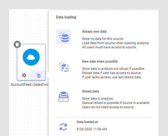 通常、データ ロード設定は、[データ キャンバス] でデータ ソース ノードをクリックすると使用できますが、分析を保存するときに直接設定を変更することもできます。