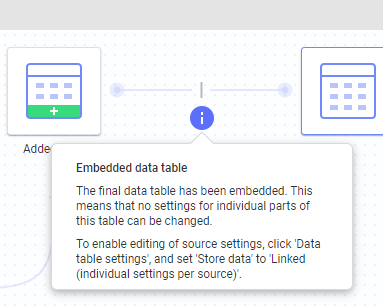 データ キャンバスのデータテーブルの [設定] ポップオーバーには、保存されたデータ (インメモリのみ) に使用できる追加の設定があります。そこでは、 [リンク (ソースごとに個別の設定)] から [分析ファイル内にデータを保存する] に切り替えることができます。リンクされたデータのデータ ロード設定が追加される前は、この設定が多用されていました。ただし、埋め込みデータ設定が優先される場合もありました。どちらを選択するかは、使用するデータ、および誰が分析のエンドユーザーでどのデータ ソースにアクセスできるかによって決まります。上で述べたように、リンク オプションは柔軟性に優れ、データテーブルの各部分に対してさまざまなデータ ロード設定を選択することができます。したがって、リンク オプションはほとんどの場合に推奨されるソリューションです。