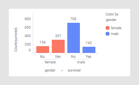 각 마커(여기서는 각 막대가 마커임)의 재계산이 수행됩니다. 예를 들어 왼쪽에서 두 번째 막대에는 생존한 여성이 타이타닉호 승객의 약 23%임이 표시됩니다(307/(156+307+708+142).