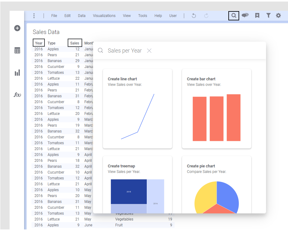 를 클릭합니다. 검색 필드가 열리면 시각화하려는 항목을 입력합니다. 그러면 발견된 일치에 대한 시각화가 제안됩니다. 예를 들어 탐색하려는 데이터 컬럼의 이름을 입력하면 아래 이미지처럼 시각화가 제안됩니다. 그런 다음 관심 있는 시각화를 클릭하거나 분석으로 드래그하고 탐색합니다.