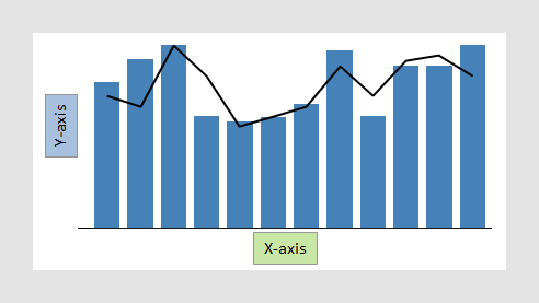 El gráfico combinado tiene similitudes tanto con los gráficos de barras como con los gráficos de líneas. Al igual que sucede con estas visualizaciones, las columnas que contienen datos numéricos normalmente se seleccionan en el eje Y. Para cada punto de datos del eje X, los datos se agregan en valores en el eje Y. Un valor agregado podría ser, por ejemplo, una suma o un promedio. Estos valores se muestran en forma de barras o en forma de una línea para cada columna o categoría que se va a comparar.