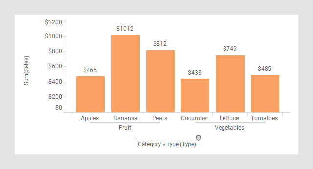 O gráfico de barras abaixo apresenta números absolutos de vendas para vários produtos. Os produtos foram estruturados hierarquicamente no eixo de categoria.