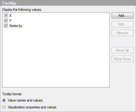 Opens the Add Tooltip Value dialog, where you can add the content from another column, hierarchy, or any custom expression to be shown in the tooltip. You can also use images in tooltips. See Highlighting in Visualizations for more information.