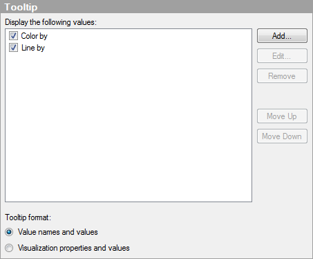 Opens the Add Tooltip Value dialog, where you can add the content from another column, hierarchy, or any custom expression to be shown in the tooltip. You can also use images in tooltips. See Highlighting in Visualizations for more information.