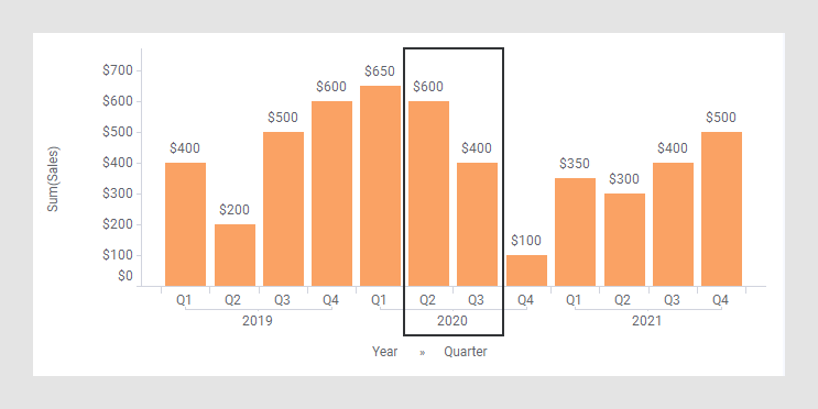 起点使用下方的条形图。其中显示了三年的季度销售额。