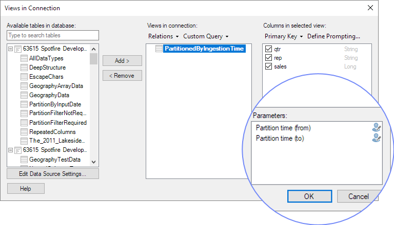 If a partitioned table has mandatory partitioning columns, prompts are automatically created for the corresponding parameters in Spotfire. If you want to use on-demand as input for the parameters, you can remove the prompts for the parameters.