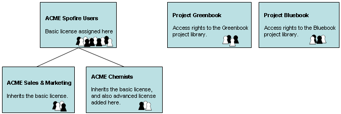 However, not all groups need to be placed in the same hierarchical top-down tree. It can, for example, be very powerful to handle licenses via a hierarchical tree, but parallel to that, create a number of separate top-level groups which correspond to another property of your company, such as projects. These groups could be used to handle Spotfire Library privileges.