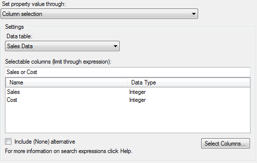 Lists all columns that will be available for selection in the property control. If not all columns in the data table should be available, you can type an expression to limit which columns to show. Expressions can limit the available columns to ones of a certain data type, like "DataType:Integer" or simple conditions using the column names or the beginning of the names to show, e.g., only columns beginning with A: "A". For more information about possible search expressions, see Searching in Spotfire. |