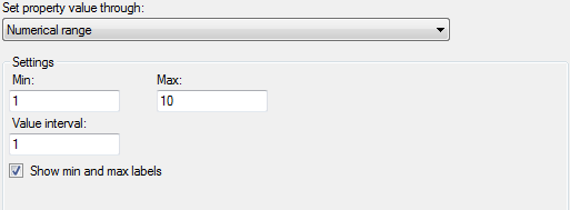 Displays a range of values from min to max using a specified value interval. Can be used with numerical properties only.