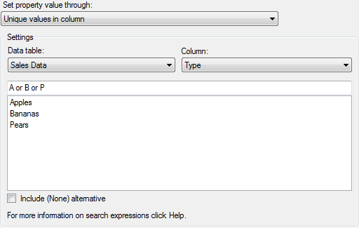 Lists all values that will be available for selection in the property control. If not all values in the column should be available, you can type an expression to limit which values to show. Expressions can limit the available values to show, e.g., only values beginning with A: "A". For more information about possible search expressions, see Searching in Spotfire. |