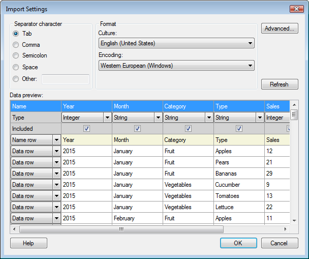 Updates the Data preview field to reflect any changes made to the settings in this dialog or the Import Settings - Advanced dialog. |