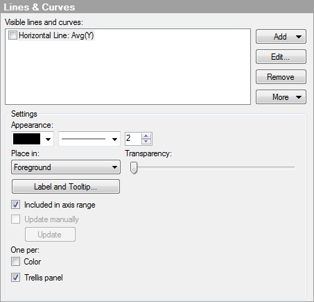 Select the check box to "freeze" the line or curve so that it is not automatically recalculated upon filtering. You can update the line or curve by clicking the Update button below or by right-clicking the visualization and selecting Update Lines and Curves and clicking the one you want to update. Note: Not applicable for points. |