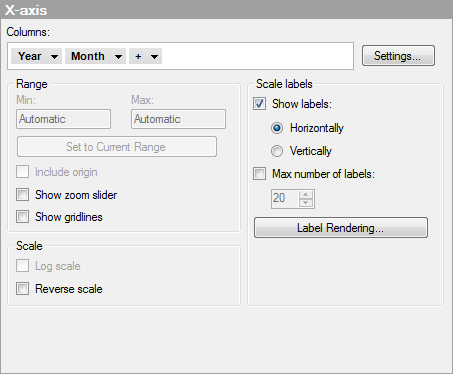 [Only available when the selected column only can be categorical. For example, if the selected column is a string column or a binary column.] Opens the Label Rendering dialog where you can change the rendering method of the axis labels from text to images in applicable cases. |