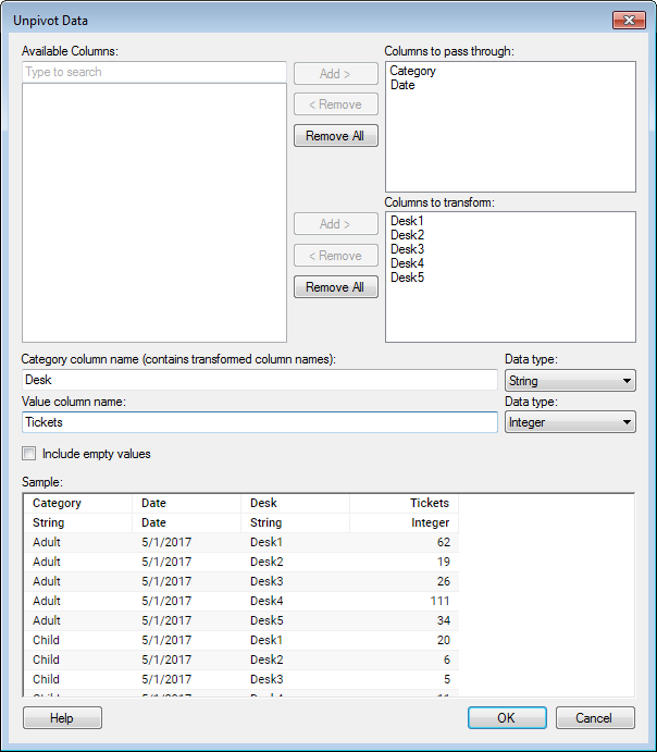 However, at this point, rather than needing to know which counter sold how many tickets to whom, we are more interested in analyzing our ticket sales in general. Therefore, we unpivot the data, combining the Desk columns into one, which we name "Desk" and merging all ticket sales to another column, which we name "Tickets".