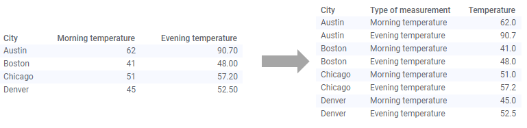 The example below shows an unpivot transformation on a very simple data set. In the original data table, there are three columns and four rows. Each row contains a city, a morning temperature and an evening temperature for each city.