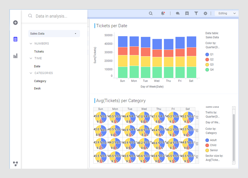 In this example, we have a larger data set containing data on the sales of entrance tickets for a museum. The original data table shows data for each of the five ticket counters (desks) and the number of tickets they have sold to adults, children and senior citizens each day.