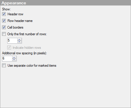 Specifies whether or not the column headers at the top of the graphical table should be visible. Tip: If you want to show or hide a specific column header, instead of the entire row of headers, open the Settings dialog for the column of interest, go to the General page and then select or clear the check box Show name in header. |