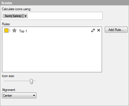 Opens the Add Rule dialog where you can define a rule to control when a row should display a certain icon. For example, you can define one rule to give the top five items in your data a particular icon and another rule to provide a different icon for all other rows. See Details on Add/Edit Rule for full descriptions of the rule types.