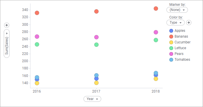 If you start slicing the data into smaller parts, the result could look like the example below, where each marker represents the sum of the sales for each product for each year.