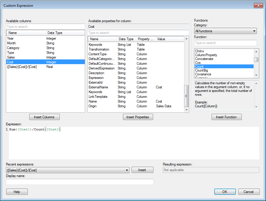 In the Custom Expression dialog, enter the expression Sum([Cost])/Count([Cost]), either by typing it directly in the Expression field or by inserting columns and functions from the lists, and click OK.