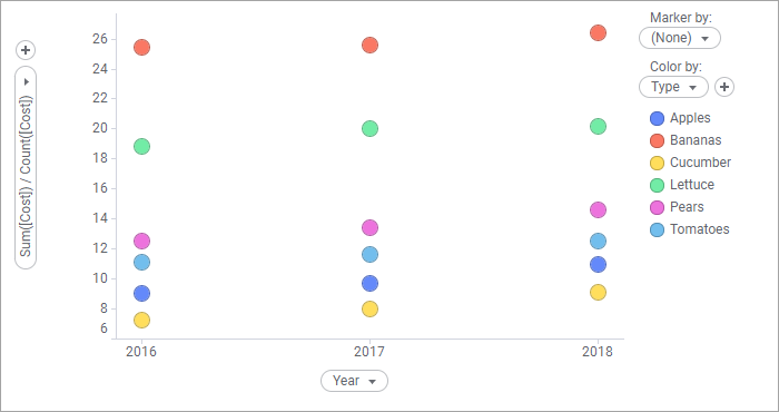 Setting up a visualization is basically deciding how the data is to be divided and how the data is to be aggregated over the slices. In the examples above, the aggregation method is Sum(), which in this case means that the total value of all sales for each product and year are summed up in one marker.