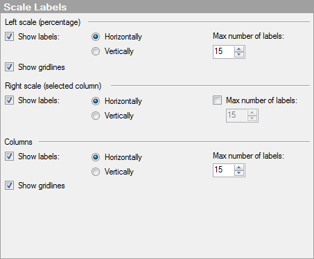 Specifies the maximum number of scale labels to be shown on this axis. Select the check box that is available for the right scale settings if you want to specify a maximum number of scale labels to be shown. Limiting the number of labels can improve readability on an axis scale with many values. |