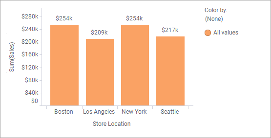 막대 그래프는 위의 데이터 테이블을 기반으로 하며 네 도시에 있는 상점의 총 판매액을 표시합니다.