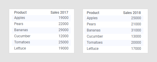 向分析中添加多个数据表时(在任何 Spotfire 客户端中),Sportfire 将会自动匹配具有相同名称和数据类型的列。例如,如果您将以下数据表加载到 Spotfire 中,则匹配项将自动添加至名为“产品”的列之间。