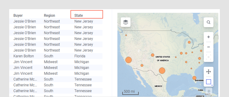 在此示例中,州列被自动识别为美国各州,并且数据在地图上的位置正确。