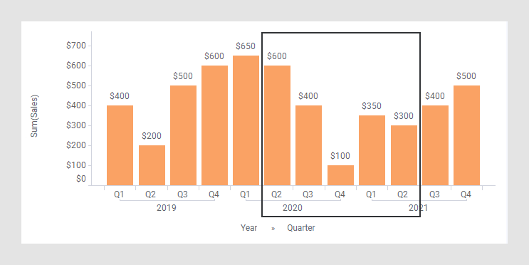 起点使用下方的条形图。其中显示了三年的季度销售额。